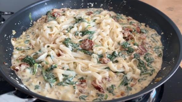 Zatim dodajte sitno iseckan beli luk. Paradajz isecite na manje komade i stavite u tiganj. Pržite neko vreme. Zatim dodajte svež spanać i pržite dok ne omekša. Sir isecite na kockice i stavite u tiganj. Zalijte pavlakom, začinite solju i biberom i promešajte. Na kraju dodajte kuvanu testeninu i lagano mešajte dok se sastojci ne sjedine.