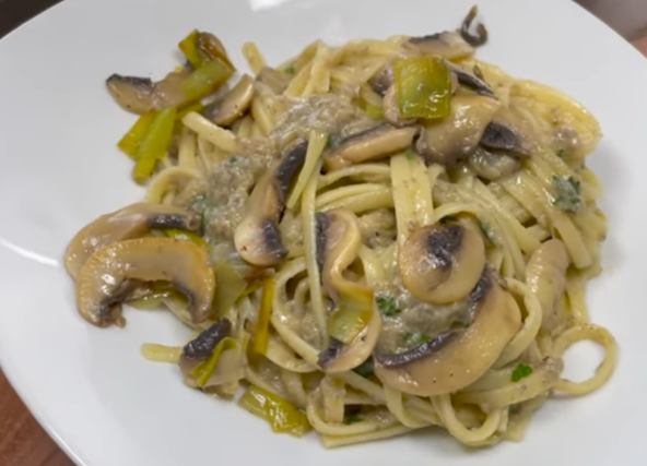 Stavite taljatele da se kuvaju. Isecite praziluk i šampinjone, pa propržite na maslinovom ulju. Dodajte 1 šolju vode u kojoj su se kuvale taljatele. Promešajte. Sipajte u blender malo pečuraka i prazilika sa malo sosa i izblendirajte. Preostale pečurke i luk izvadite na tanjir. Ispasiran sos sipajte u tiganj i dodajte taljatele. Lepo promešajte i prelijte komadima pečuraka i praziluka.