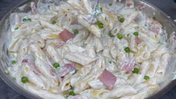 Na malo ulja propržite grašak, pa dodajte iseckanu šunku. Makarone skuvajte, procedite, pa dodajte u tiganj. Zatim dodajte i puter, pa lepo promešajte. Kada se puter istopi dodajte krem sir i rikota sir i promemešajte dok se ne otopi i sjedini. Posolite i pobiberite i opet promešajte.