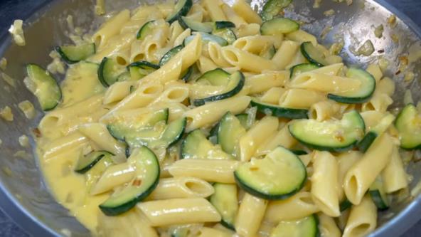Testeninu skuvajte. Na maslinovom ulju propržite luk i tikvice. Pomešajte parmezan sa žumancima i malo vode od kuvanja testenine. Testenine procedite i ubacite u tiganj sa tikvicama i lukom. Dodajte žumanca i promešajte.