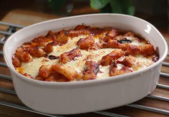 Izvadite ih i ostavite da se osuše, pa prelijte sa par kapi ulja. U tiganj sipajte maslinovo ulje i cele čenove belog luka, a kada dobije zlatnu boju, bacite ga. Sipajte paradajz sos, posolite, pobiberite i pospite seckanim bosiljkom. Kad krene da ključa smanjite vatru i nastavite da kuvate još 10 minuta, uz povremeno mešanje. Dodajte njoke u šerpu sa paradajz sosom i lagano promešajte. Nakon toga sipajte sos i njoke (pola količine) u tepsiju, pa pospite seckanom mocarelom i pospite parmezanom. Preko sipajte preostale njoke i pecite u zagrejanoj rerni na 220°C oko 15 minuta. Izvadite iz rerne i ostavite da se ohlade 15 minuta.