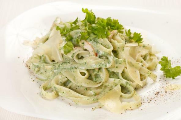5. Skuvati taljatele u dosta slane vode, prema uputstvu sa pakovanja. Procediti i sačuvati malo tečnosti od kuvanja. Izmešati taljatele, tečnost od kuvanja, piletinu i pesto od sremuša. Servirati uz parmezan, po želji i ukrasiti peršunom.