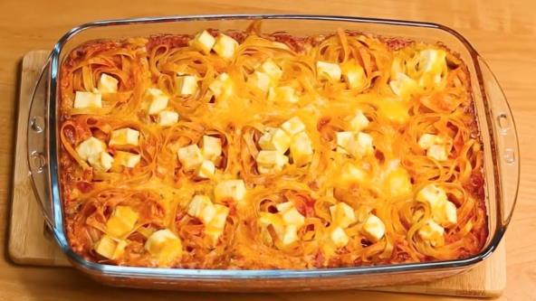 Sirove taljatele utisnite u sos tako da budu dobro pokrivene. Po vrhu ravnomerno pospite fetu iseckanu na kockice i rendani sir.