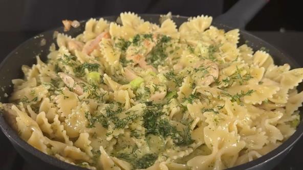 U međuvremenu skuvajte testeninu u posoljenoj vodi prema uputstvu na pakovanju. Ocedite je i sačuvajte malo vode od kuvanja.
