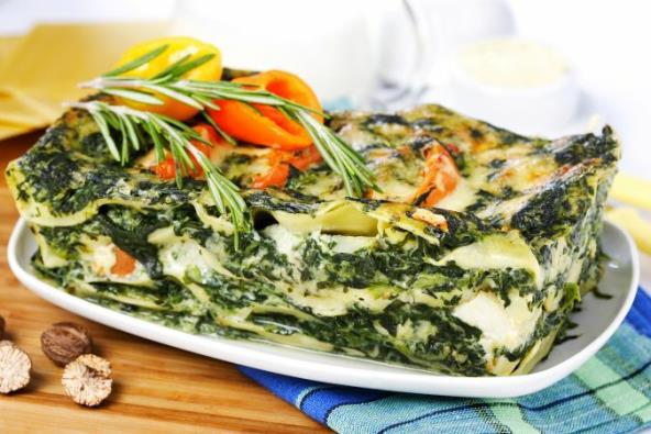5. Ređati u nauljeni pleh: lazanje, spanać i sos. Završiti sosom i posuti kašikom parmezana. Peći 30 minuta.
