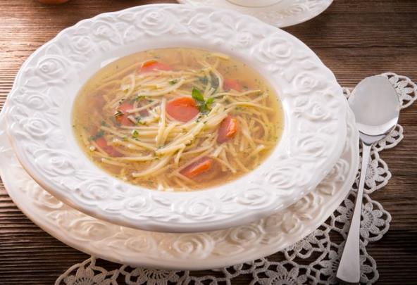 2. Iseckati celer, šargarepu i koren peršuna. Iseckati luk na sitno i dodati ga supi. Kuvati oko 20 minuta, posoliti i pobiberiti. Dodati muskatni oraščić. Iz supe izvaditi meso i jaje za čaj sa začnima. Staviti rezance i prokuvati kratko.