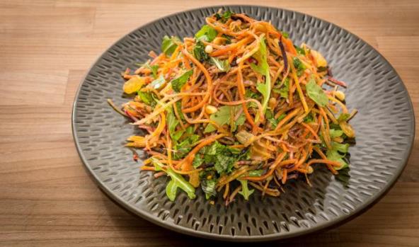2. Pomešajte sve u posudi za salatu, pa začinite uljem, sitno iseckanim bosiljkom, sokom od limuna, soja sosom i korijanderom.