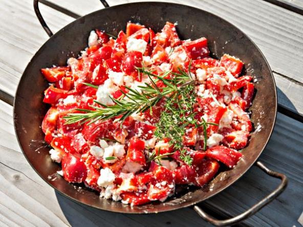 Sada paprike gore posuti sa malo bibera i sa izmrvljenim feta sirom. Salatu ostaviti u frižderu pokriveno sa providnom folijom 1-2 sata da se ukusi izmešaju.