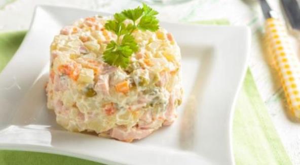 Krompir i šargarepu iseći na sitne kockice. Staviti u ključalu posoljenu vodu i kuvati oko tri minuta. Skuvati grašak dok ne postane mek (oko 15 minuta). Šunku, kisele krastavčiće i kuvana jaja iseći na kockice. Sve sastojke pomešati, dodati majonez, limunov sok i začine. Dobro izmešati i staviti u frižider da se ohladi. Servirati hladno.