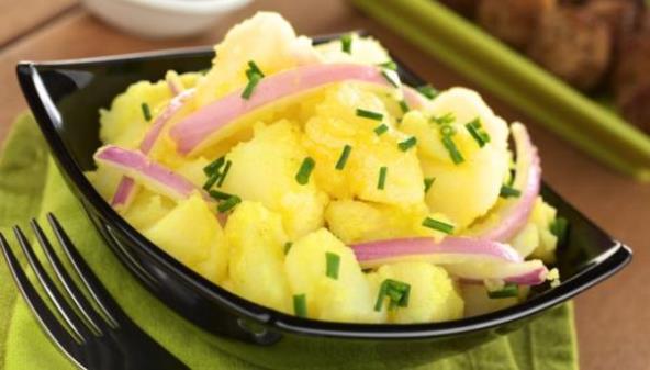 2. Crni luk isecite na režnjeve, a peršun krupno. Posolite i pobiberite, dodajte ulje pa limun. Dobro izmešajte da krompir upije začine i na kraju dodajte peršun. Ukrasite režnjevima luka i celim listićima peršuna. Ova salata se služi i topla i hladna. Ukoliko je pravite s belim lukom, isecite ga što sitnije.