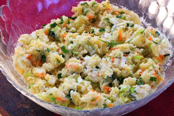 Ukusna, kremasta krompir salata sa mirođijom i mladim belim lukom. Možete je poslužiti uz ribu ili pohovano meso, ili jednostavno izmešam sa konzervom tunjevine i to bude savršen, lagan obrok.