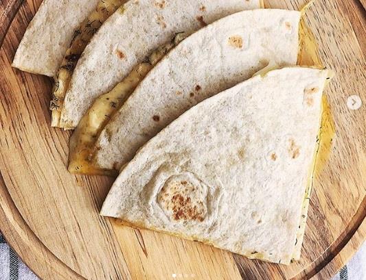 Premazati dve tortilje namazom od belog luka i mirođije. Na jednu od te dve naređati listiće kačkavalja pa je drugom preklopiti, a zatim zagrejati u mikrotalasnoj 1 minut (ako nemate mikrotalasnu može toster). Iseći na kriške!