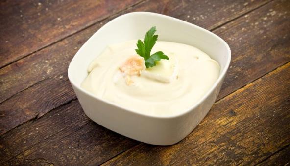 Jogurt, pavlaku i ren penasto izmešajte. Posolite i dodajte seckane orahe i ostale plodove, sirće i ulje, pa promešajte i stavite u frižider do upotrebe. Pred serviranje dodajte seckan peršun, pospite čilijem i biberom.