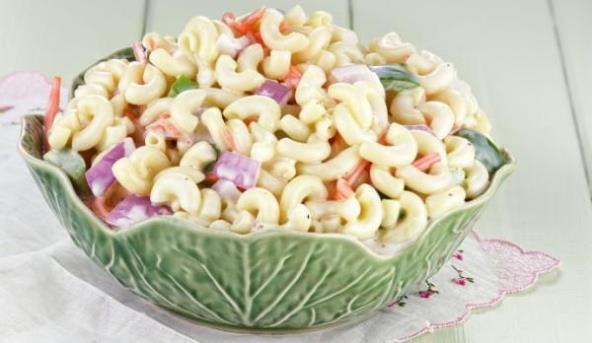 2. U velikoj činiji pomešajte zajedno majonez, senf, sirće , šećer, so i biber dodajte beli luk, celer, zelenu papriku, i šargarepu. Zatim ovu smesu sjedinite sa skuvanim makaronama. Ostavite u frižideru četiri sata pre služenja, poželjno je čak i da odstoji celu noć u frižideru.