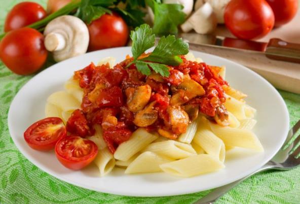 Blago zagrejte ulje i dodajte sitno seckane crni i beli luk i malo vode. Dinstajte na slaboj vatri, više kuvajte nego pržite. Kad luk omekša, dodajte začine, zatim paradajz i kečap. Kad je skoro gotovo, sipajte pečurke sečene na listiće i kuvajte još 5 minuta. Sklonite s vatre i dodajte malteks i sirće.