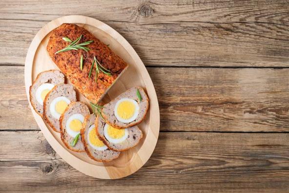 Parče alu folije nauljite, pa preko nje rastanjite smesu od mesa, tako da dobijete pravougaonik. U sredinu poređajte jaja, pa lagano uvijte u rolat.