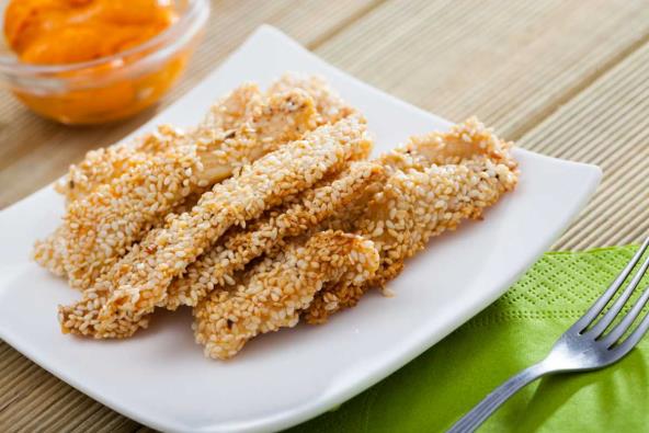 Oprati šargarepe, očistiti i po dužini iseći na trakice. Operite začinsko bilje, prosušite i iseckajte (za vinegret sos). Oprati limete, koru jednog voća narendati i obe limete ispasirati. Oljuštiti čen belog luka i đumbir lepo iseckati. Zatim sve sastojke za vinegret pomešati sa soja sosom, 2 kašike ulja, biberom, medom, pa pripremljen sos dodati šargarepi. Oprati ćureće grudi, istući drvenim tučkom i iseći na fine trake. Izmešati belance i žumance. Meso najpre uvaljati u brašno, onda u razmućeno jaje i na kraju u susam. Ostatak ulja zagrejati u tiganju i meso peći oko 10 minuta. Potom trake ćuretine sa hrskavom korom servirati zajedno sa salatom od šargarepe, a po želji garnirati listićima peršuna ili bosiljka.