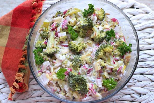 Brokoli operite i kuvajte u vodi sa 1 kasikom soli, od tacke kljucanja 15 minuta. Suncokret proprzite u tiganju. Iseckajte crni i beli luk, kackavalj, brokoli i sve sastojke promesajte. Posluzite odmah, moze da stoji i jedan dan u frizideru.