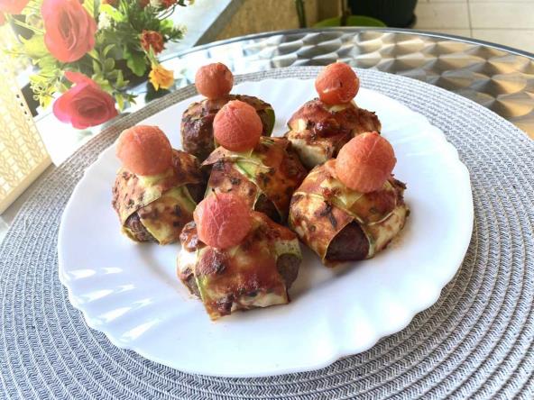 Izrendajte crni luk, pa ga dodajte u mleveno meso. Začinite i sipajte sodu bikarbonu, jaja i prezle i rukama napravite kompaktnu smesu. Zatim od te smese napravite kružiće koje ćete ispržiti. Kada se isprže uvite ih u tikvice, stavite papriku i čeri paradajz odozgo. Paketiće poređajte u pleh za pečenje. Napravite preliv od zagrejanog ulja u koje ste dodali paradajz pastu, vodu i vlašac. Prokuvajte i prelijte preko paketića. Zapecite u rerni destak minuta. Po želji posuti parmezanom.