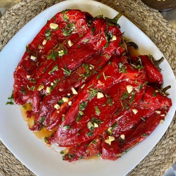 Paprike dobro oprati i peći u rerni na 200 stepeni 25 do 30 minuta. Zatim paprike oljuštiti od kožice. Iseckati sitno beli luk i peršun. Pomešati sa očišćenim paprikama. Začiniti po želji. Prijatno!