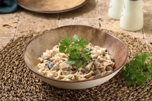 Belo meso obarite i iseckajte na sitne kockice. Pečurke isecite na kockice i dinstajte na puteru dok ne ispari sva voda. Dodajte iseckan peršun i pečurke sjedinite sa belim mesom. Izrendajte jaja i krastavce, pa dodajte u meso i pečurke i na kraju sipajte kiselu pavlaku i promešajte.