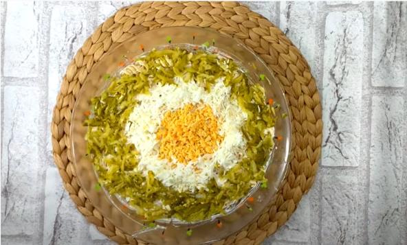 Spremljenu piletinu isecite na sitno i stavite u činiju. Kuvana jaja i krastavčiće izrendajte. Dodajte kuvane makarone i sve promešajte. Zatim dodajte majonez, senf i pavlaku i malo posolite i pobiberite. Sve pomešajte da se sastojci sjedine. Stavite u frižider da se stegne, a pre služenja dekorišite krastavčićima i kuvanim jajetom.