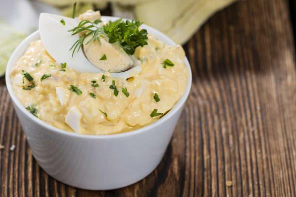 Obarite jaja i isecite na polovine. Pomešajte pavlaku i majonez i prelijte preko prevrnutih polovina.