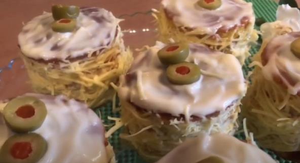 Pečenu koru isecamo čašom, praveći krugove. Ostatak od kora ćemo ubaciti/ izmrviti u fil. Zatim uzimamo krugove biskvita i filujemo ih. Zatim uzimamo namaz po izboru, u ovom slučaju majonez i premazujemo rusku kapu. Uvaljamo celu rusku kapu u rendani kačkavalj. Dekorišemo po želji i poslužimo.
