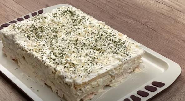 Slanu tortu dekorišemo peršunom i narendanim žumancetom.