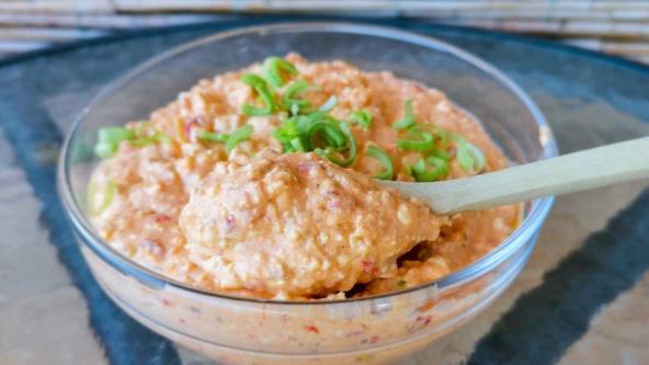 Pomešajte sir i kiselu pavlaku. Dodajte tri vrste luka. Crni luk, praziluk i beli luk. Stavite senf, dimljenu papriku, beli luk u prahu. Promešajte dobro.