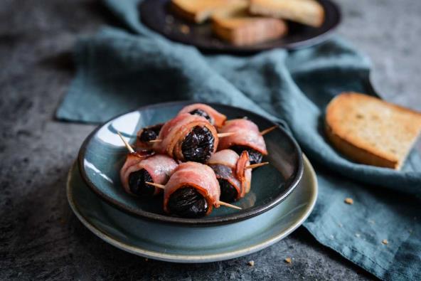 Slaninu isecite na duge tanke listove, dužine dovoljne da može da se obmota oko šljive. Zatim šljive uvijte u slaninu i svaku pričvrstite čačkalicom, ili ih poređajte na ražnjić štap. Pecite u rerni 10-15 minuta na 200°C, ili dok slanina ne postane blago reš.