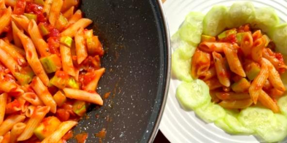 Tikvice iseckajte na kockice, posolite i propržite. Zatim dodajte paradajz sos i začinite. Makarano skuvajte i kada se tikvice i paradajz uprže dodajte skuvane makarone. Lepo promešajte i ostavite još 1-2 na šporetu.