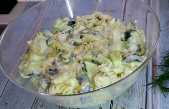 Makarone skuvajte i ocedite. Krastavac, masline, beli luk, jaja i mirđiju iseckajte i stavite u činiju gde su makarone. Sipajte jogurt, maslinovo ulje, malo isceđenog limuna i malo narendajte fetu. Malo posolite i dobro promešajte. Na kraju dodajte i pavlaku i opet promešajte.