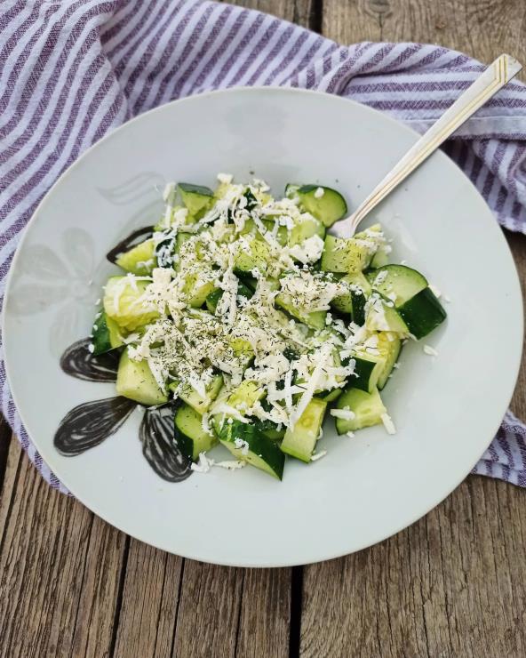Krastavac i crni luk isecite na sitne kocke. Dodajte sir, pa promešajte. Zatim dodajte mirođiju, ulje, so i biber. Sve dobro sjedinite i stavite u frižider da se ohladi.