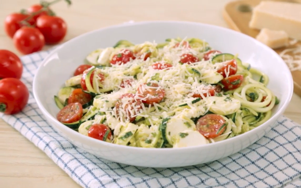 Tikvice isecite da budu kao špagete. Dodajte im pesto sos i promešajte dobro. Posolite i pobiberite, pa dodajte čeri isečena na pola, kao i manje komade mocarele i iseckna bosiljak. Poslužite odmah posuto parmezanom ili čuvajte u frižideru do 3 dana.