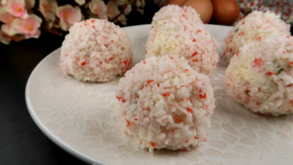 Izrendajte sve sastojke, sem belog luka i vlašca to iseckajte. Zatim u činiji pomešajte sve, samo što stavite polovinu izrendanih kraba štapića, ostalo ide u punoj meri. Formirajte kuglice, a preostale kraba štapiće izblendirajte i kuglice uvaljajte u usitnjene krabine štapiće.