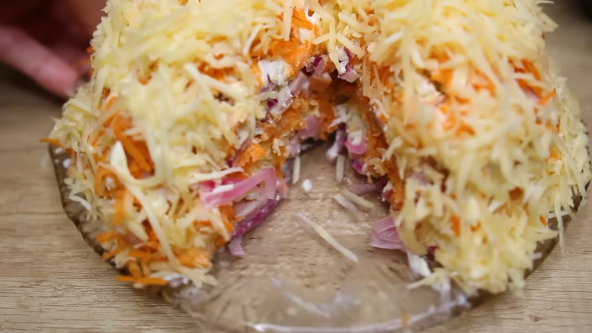 Isecite crni luk na rebarca, pa rukama malo zgnječite. Dodajte šećer, so i sirće, pa prelijte ključalom vodom. Ostavite 10-ak minuta. Jaja skuvajte, pa izrendajte kao i šargarepu, sir i jabuku. Šunku isecite na kockice. Procedite luk. Na tacnu poređajte pola količine luka, pa pola količine šunke. Sipajte majonez. Zati pola količine jaja i pola količine sira. Opet ide red majoneza. Pola količine šargarepe, pa celu količinu jabuka i preostalu šunku. Sipajte majonez. Zatim preostali luk i jaja, pa opet majonez. A onda preostala šargarepa, majonez, pa sir.