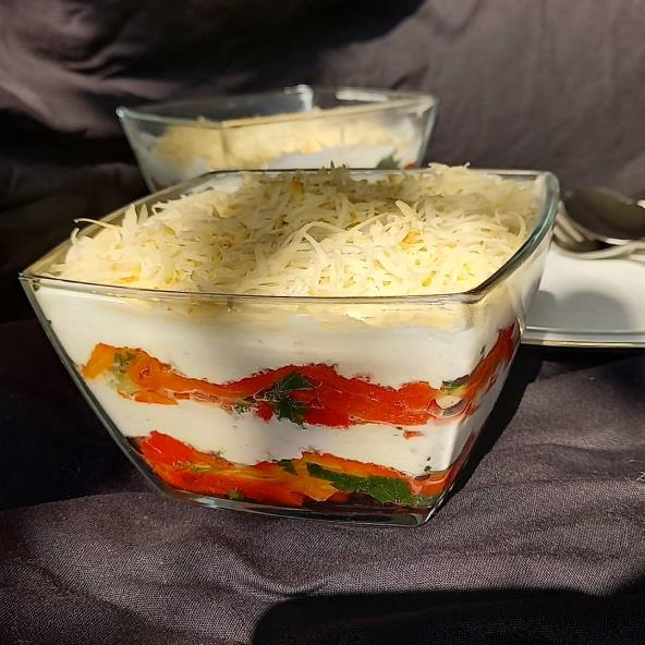 Na dno činije poređajte papriku, odozgo premažite sir, pomešan sa pavlakom. Preko toga premažite majonez u tankom sloju pa opet paprika i tako redom. Obično bude 2 sloja paprike i dva sloja fila. Odozgo narendajte bilo koji kačkavalj. Salatu dobro ohladite pre služenja i uživajte u ukusu.