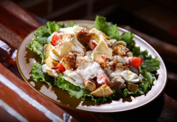 3. Meso oprati, posušiti i iseći na kockice. Pržiti ga na preostalom ulju, dok ne porumeni. Servirati u tanjirima prvo salatu, pa odozgo staviti kockice ćurećeg mesa, komadiće tosta i koktel paradajz. Preliti pripremljenim dresingom. Po želji posuti krupno mlevenim biberom ili nekim drugim začinom po želji.