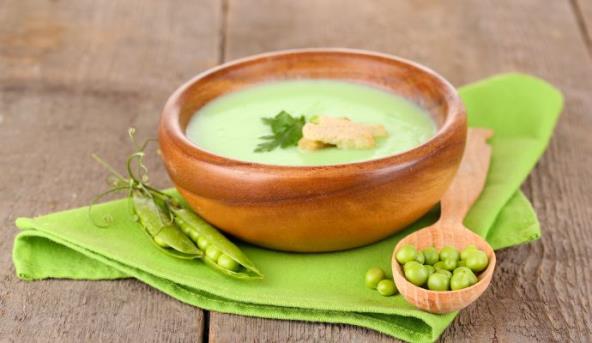 1. Procediti grašak. Mladi luk iseći na kolutove. Oljuštiti krompire i iseckati ih. Zagrejati maslac u velikom tiganju i propržiti luk i krompir. Na kraju dodati grašak i podgrejati ga kratko. Naliti supu i krèkati oko 20 minuta.