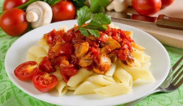 2. Paradajz oljuštite i sitno naseckajte, stavite u poklopljenu šerpu, posolite, pobiberite i dinstajte dok šampinjoni ne omekšaju. Servirajte uz testeninu ili bareni pirinač.