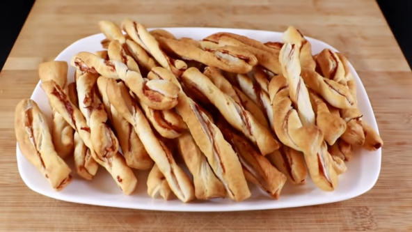 Razvucite lisnato testo, pa poređajte pršutu, a preko stavite drugo razvučeno testo. Oklagijom poravnajte, a zatim isecite tanke trake. Urolajte i pecite na 200°C oko 15 minuta.