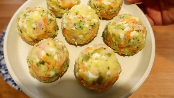 Krompir izgnječite lagano pa zagrevajte na šporetu uz konstantno mešanje da se osuši i pretvori u pastu. Zatim u krompir dodajte rendanu šargarepu, rendanu stabljiku i cvetove brokolija, seckane krastavčiće, šunku, rendan beli luk i kuvana jaja. Dodajte so, biber i majonez ili grčki jogurt. Sve dobro promešajte i pravite kuglice. Možete smesu vaditi i kašikom za sladoled.