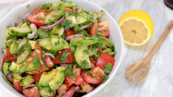 Isecite krastavac, paradajz, luk, avokado i korijander. Pomešajte, pa posolite i pobiberite. Začinite uljem i maslinovim sokom. Poslužite uz roštiljsko meso.
