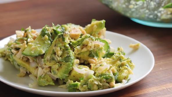 Krastavac, luk i avokado iseckajte, a zatim pomešajte i dodajte tunjevinu koju ste prethodno dobro ocedili. Posolite i pobiberite, pa dodajte seckani korijander ili peršun. Začinite uljem i limunovim sokom i vaša salata je spremna.