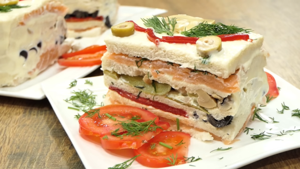 Kalup za tortu obložite plastičnom folijom. Po dnu poređajte tri kriške hleba, a onda premažite majonezom, pa stavite pola količine lososa ili šunke. Ponovo red hleba i majonez, a onda poređajte secaknu papriku i masline, pa još jedan red hleba i majoneza. Preko poređajte seckane pečurke i kisele krastavce, pa još jedan red hleba, premažite majonezom i poređajte preostali losos ili šunku. Bogato pospite mirođijom. Poslednji red je hleb. Umotajte folijom i ostavite u frižideru 4 sata. Izvadite slanu tortu iz kalupa, pa premažite majonezom u tankom sloju. Dekorišite po izboru.