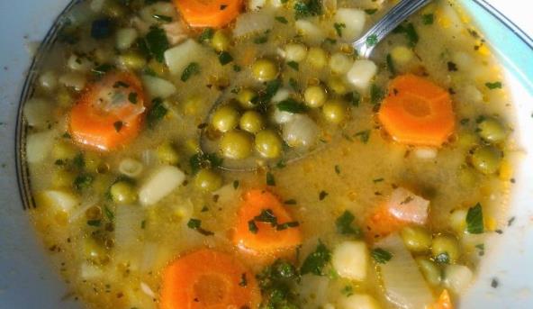 2. Šargarepu ogulite, isecite na tanke kolutove, krompir na sitne kockice i dodajte na luk. Zatim dodajte grasak i sve zajedno malo jos propržite. Dodajte jednu kašiku brasna, aleve paprike po želji, i nalijte vrelom vodom (količina vode zavisi od željene gustine).