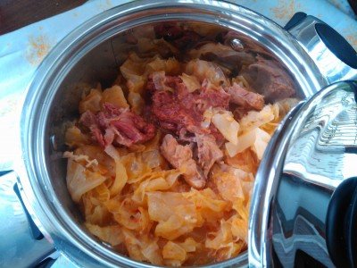 Dodati u ekspres lonac ili šerpu jednu glavicu seckanog kupusa pa u sredinu poredjati suhomesnato, lorber, pa odozgo naseckajte drugu glavicu. Dodati mast, alevu i ljutu papriku, biber i očišćen i naseckan beli luk. Naliti vodom da ogrezne i staviti na tiho da se kuva oko sat ipo da voda uvri