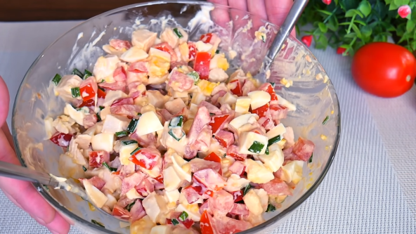 Paradajz izdubite i isecite na kockice, kao i papriku i mladi luk. Pomešajte, pa dodajte piletinu isecekanu na kockice koju ste prethodno skuvali, a zatim i kuvana jaja isečena na kockice. Sipajte preko majonez i dobro sjedinite. Umesto majoneza možete da pomešate kiselu pavlaku i senf i time da prelijete salatu.