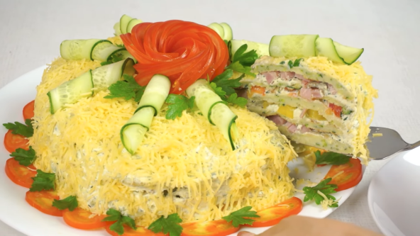 Premažite prvi palačinku sirom i sipajte pola količine šunke, preklopite drugom palačinkom. Opet premažite, pa stavite seckanu papriku, a preko još jednu palačinku. Premažite, pa stavite paradajz i preko palačinku, opet premažite. Poređajte preostalu šunku. Stavite poslednju palačinku i premažite celu tortu sirom. Ukrasite rendanim sirom, paradajzom i krastavcem.